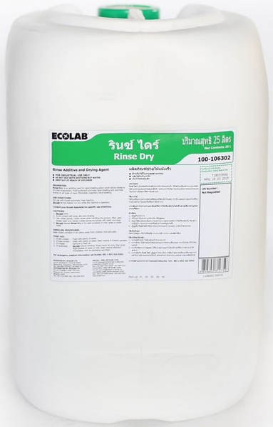 Chất tráng cho máy rửa chén Ecolab Rinse Dry 25L là sản phẩm chất tẩy rửa dạng lỏng được sản xuất bởi tập đoàn Ecolab - một trong những nhà sản xuất hóa chất vệ sinh hàng đầu thế giới. Sản phẩm được thiết kế để giúp sấy khô bát đĩa nhanh chóng và hiệu quả, đồng thời giúp bát đĩa sáng bóng như mới.