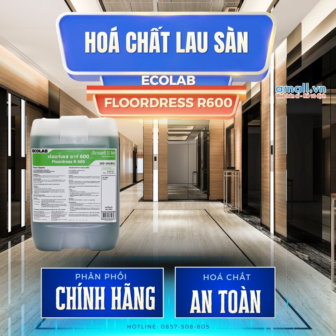 Ecolab Floordress R600 là dòng hóa chất lau sàn trung tính, giúp làm sạch hiệu quả mà không làm hư hại bề mặt. Sản phẩm phù hợp với nhiều loại sàn như gạch, đá hoặc gỗ công nghiệp.