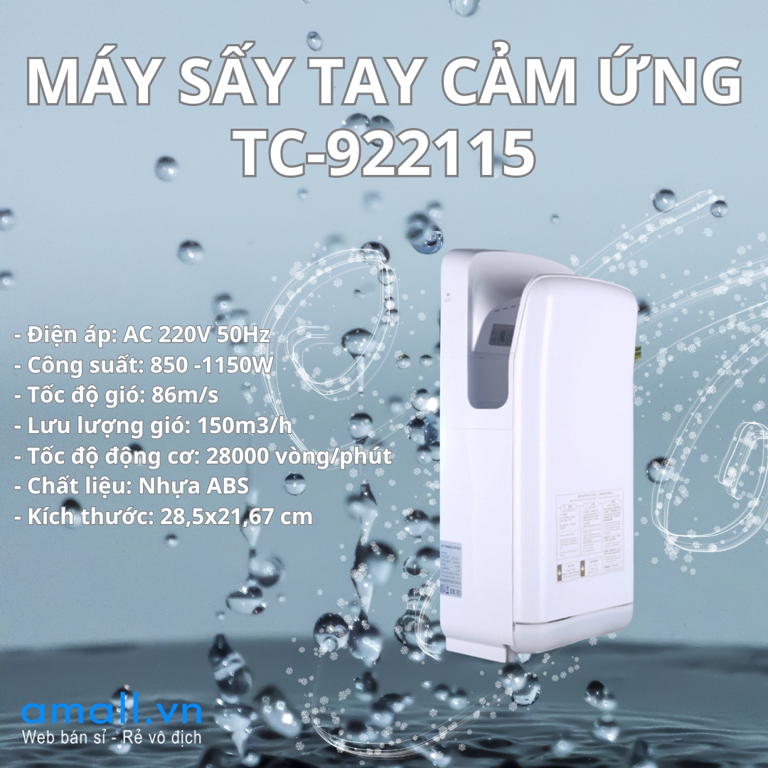 Máy sấy tay cảm ứng cao cấp TC-922115 là dòng sản phẩm hiện đại , chất lượng cao mang đến trải nghiệm sấy tay nhanh chóng, hiệu quả và an toàn cho mọi không gian. Thiết bị sử dụng công nghệ cảm biến hồng ngoại thông minh, tự động sấy khô tay mà không cần chạm vào bất kỳ nút bấm nào, giúp hạn chế tối đa việc tiếp xúc trực tiếp và giảm nguy cơ lây nhiễm vi khuẩn.