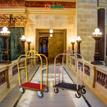 Xe Đẩy Hành Lý Khách Sạn Inox Vàng & Vàng Hồng – Tôn Vinh Đẳng Cấp Không Gian Lễ Tân
