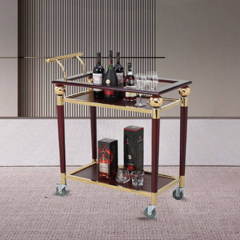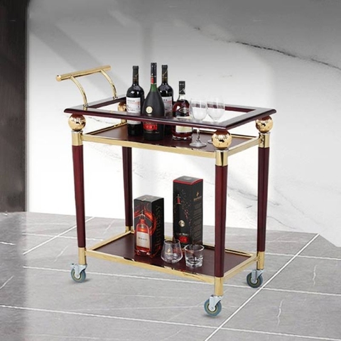 Sản phẩm được chế tác từ inox mạ vàng sáng bóng kết hợp mặt gỗ đỏ đun sang trọng, tạo nên vẻ đẹp hài hòa giữa sự hiện đại và cổ điển. Với kích thước 73 x 33 x 75 cm, xe phù hợp sử dụng trong nhiều không gian mà vẫn đảm bảo tính linh hoạt, tiện lợi khi di chuyển.