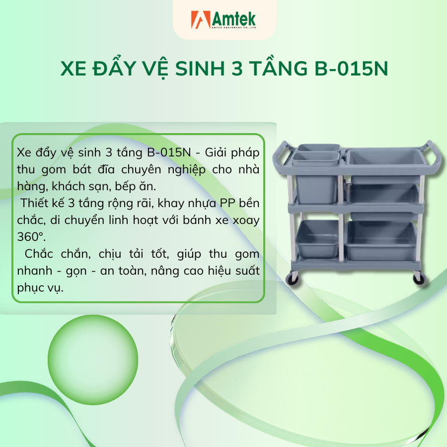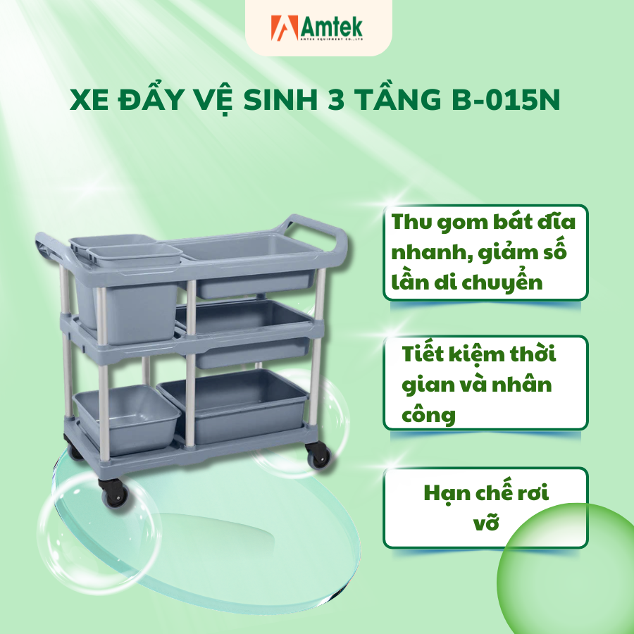 Xe đẩy vệ sinh 3 tầng model B-015N không chỉ là thiết bị hỗ trợ thu gom bát đĩa, mà còn là giải pháp nâng cao hiệu suất vận hành cho bếp công nghiệp hiện đại. Sự kết hợp giữa khung nhôm bền bỉ, tải trọng lớn và thiết kế linh hoạt giúp quy trình thu dọn trở nên nhanh gọn, an toàn và chuyên nghiệp hơn.